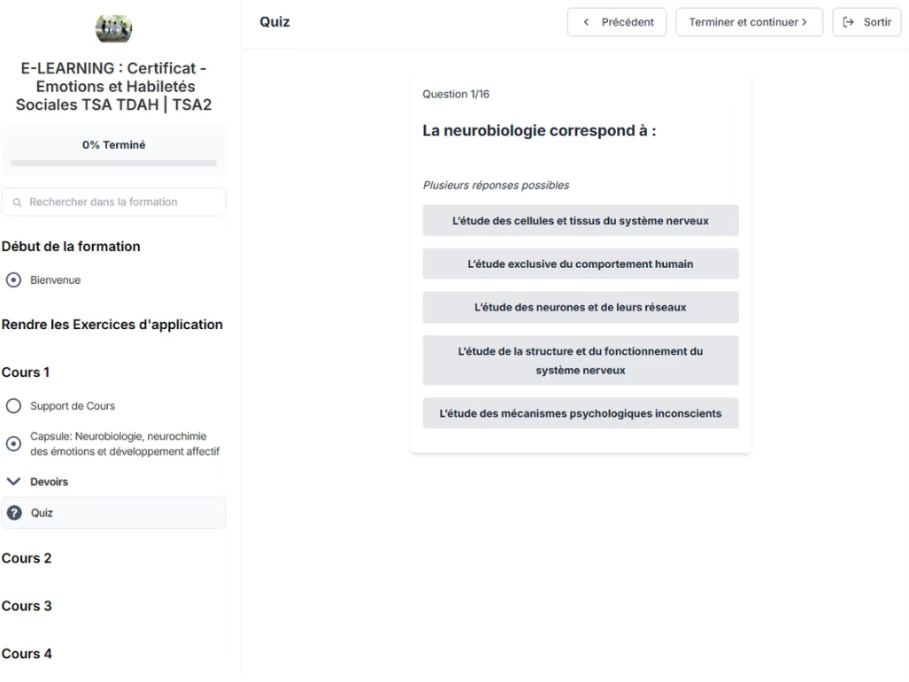 Pour obtenir la certification Emotions et Habiletés Sociales, vous devez valider l’ensemble des évaluations de cours et des exercices d’application associés à chaque capsule de formation, avec un score minimum de 90% de réussite.