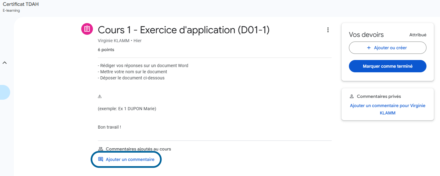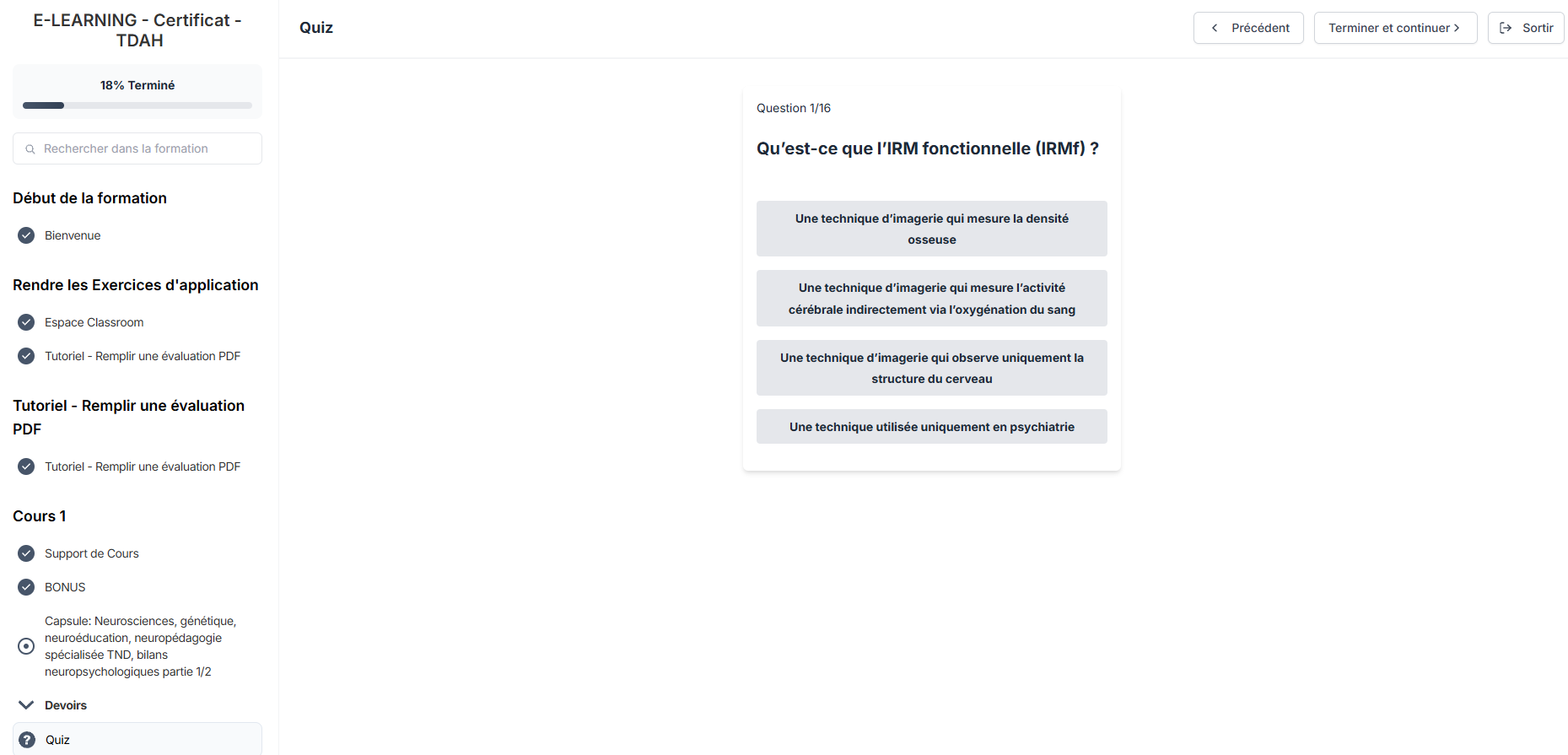 Pour obtenir la certification TDAH, vous devez valider l’ensemble des évaluations de cours et des exercices d’application associés à chaque capsule de formation, avec un score minimum de 90% de réussite.
